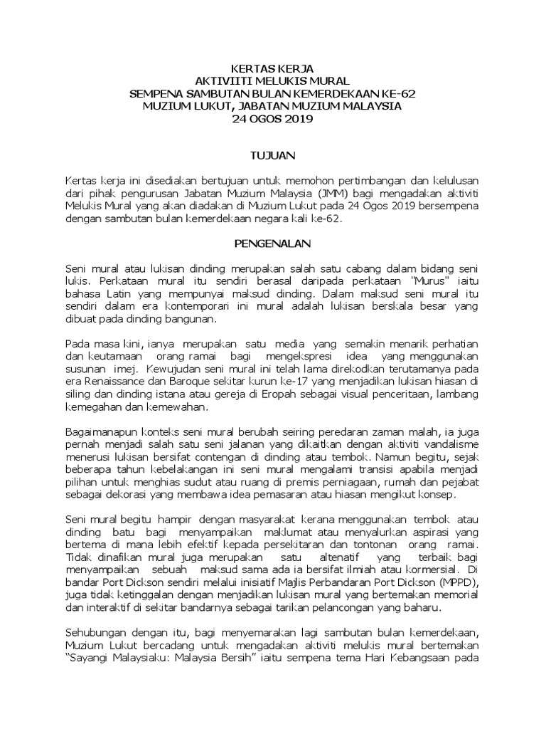 . 42 Mengeratkan hubungan silaturrahim dan. Baiklah mari kita lihat dahulu beberapa PerkongsianContoh Kertas Kerja Lukisan Mural ini. Up to 3 cash back Kertas kerja bagi mendapatkan dana membuat mural by noor2azita2ahmad.